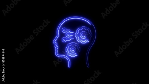 Blue Neon Human Head Profile with Gears and Circuits on Black Background artificial intelligence brain