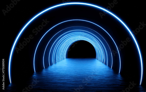 Blue neon light arch forming a futuristic tunnel