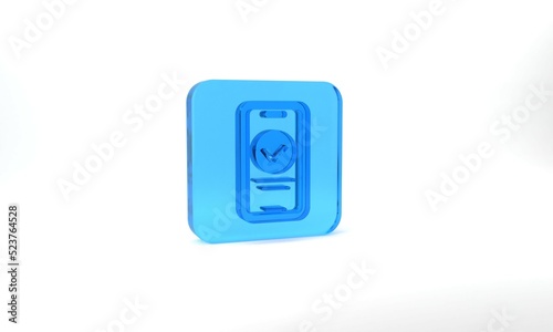 Blue Online quiz, test, survey or checklist icon isolated on grey background. Exam list. E-education concept. Glass square button. 3d illustration 3D render