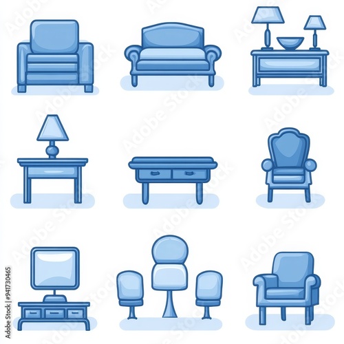 Blue Outline Furniture Icons A collection of chairs sofas tables and lamps in a simple modern style