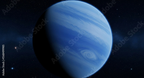 Blue planet in space, swirling clouds, dark background, stars visible, celestial body, cosmic scene, representing exploration, mystery, vastness
