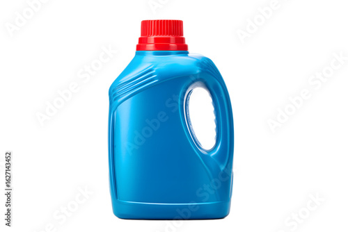 Blue plastic detergent bottle with red cap and built-in handle, isolated on white background, ideal for cleaning product mockups, household packaging design, and laundry detergent branding.