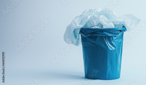 Blue plastic trash bin filled with crumpled paper and cloth napkins isolated on white background with copy space for waste management or recycling concept