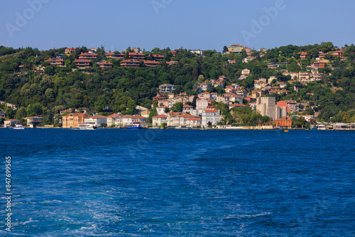 Blue seascape overlooking the coast. View of the Bosphorus in Istanbul city on sunny summer day, in a public place.