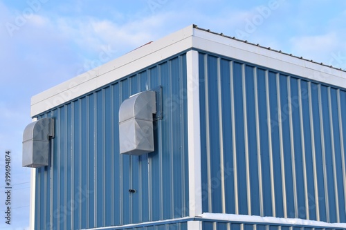 Blue, silver and white building with silver ductwork against blue sky. Interesting abstract shapes.