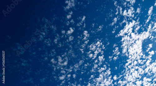 Blue sky with calm clouds background. Bright blue sky background. Cloudscape with white clouds. Calm sky cloudy on a sunny day. Sunlight through the clouds wallpaper. Spring sky with soft clouds.
