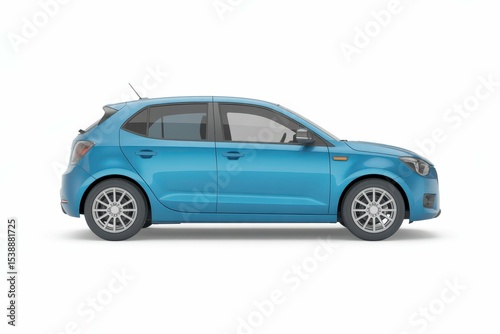 Blue small family car hatchback on white background 3d rendering, with empty blank space for text copy space or mockup design, high detail, 8k