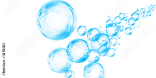 Blue soap bubbles, liquid sphere, foam freshness, underwater floating, vibrant dew, abstract shine, washing concept.