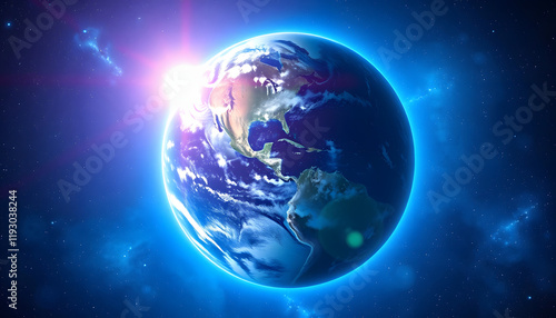 Blue space background with earth and galaxy. Abstract wallpaper with planetary glow. Science and education in outer space, 8k unreal engine photorealism, with white tones