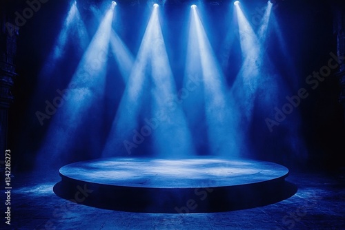 Blue spotlights shine on a circular stage surrounded by dark areas. Ideal for presentations, product reveals, and dramatic performances.