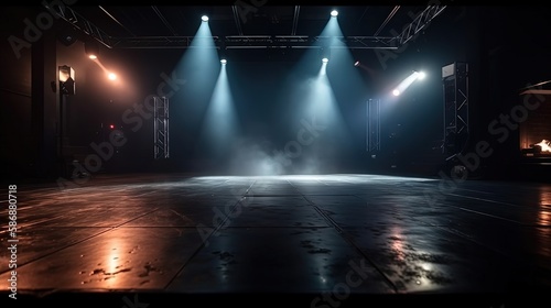 blue spotlights shine on stage floor in dark room, idea for background backdrop, music hall or studio, Generative Ai