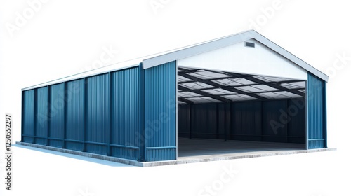 Blue Steel Garage Building: A spacious, modern blue steel garage building with a gable roof and a large open door, providing ample storage space. Ideal for various uses.