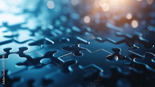 Blue strategy concept with interconnected puzzle pieces, representing teamwork.