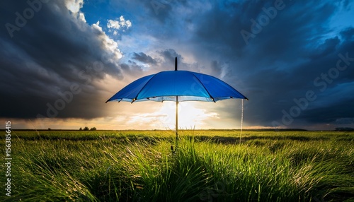 blue umbrella glowing with warm light underneath against a backdrop of stylized dark clouds and vibrant green grass