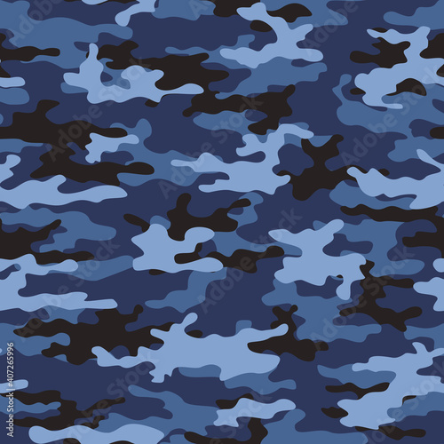 Blue vector camouflage seamless pattern with black spots for printing clothing, fabric.
