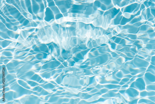 Blue water with ripples on the surface. Defocus blurred transparent blue colored clear calm water surface texture with splashes and bubbles. Water waves with shining pattern texture background.