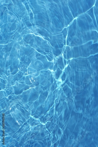 Blue water with ripples on the surface. Defocus blurred transparent blue colored clear calm water surface texture with splashes and bubbles. Water waves with shining pattern texture background.