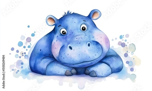 Blue watercolor hippo doll for kids on white background. AI generated illustration.