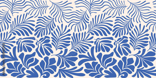Blue white abstract background with tropical palm leaves in Matisse style. Vector seamless pattern with Scandinavian cut out elements.