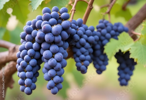 blue wine grapes on branch and blurred background, ai