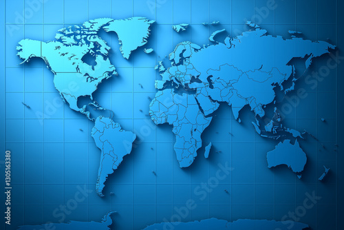 Blue World Map on White Background with Detailed Geographic Features and Grid Lines