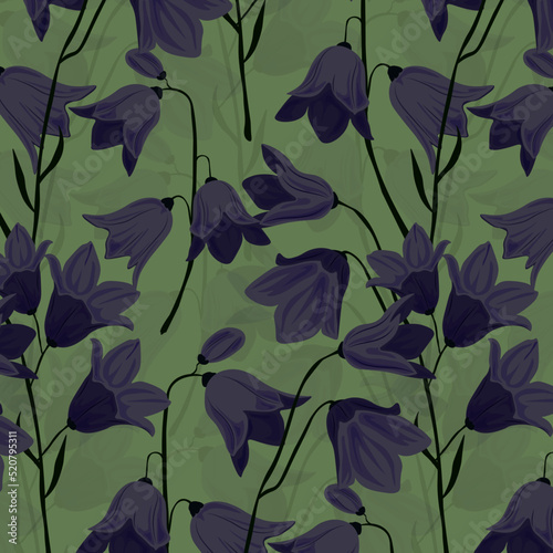 Bluebell flowers in the form of a seamless pattern. Lilac flowers on a green background. Spring and autumn motif, for fabric, diary, wallpaper. hand drawn
