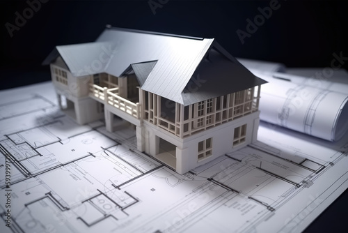 Blueprint designs and a home model for a construction project. Background in real estate, housing project building, and engineering design. plans for residential construction