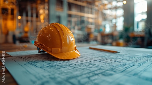 Blueprint floor plan architectural project on the table with yellow helmet and pencil