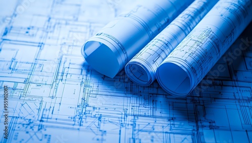 Blueprint Rolls Laid Out for Construction Project, Architectural Design Plans