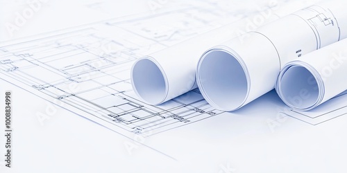 Blueprints rolled on a table, showcasing architectural plans and designs, emphasizing precision and creativity in construction.