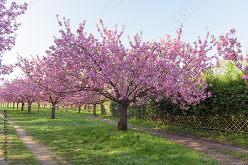 Blühende Kirschbäume in Parkanlage zum Sonnenaufgang