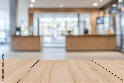 Blurred background of a bank branch with a focus on a wooden table, showcasing a sleek and professional surface for customer service interactions in a modern financial setting