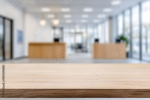 Blurred background of a bank branch with a focus on a wooden table, showcasing a sleek and professional surface for customer service interactions in a modern financial setting