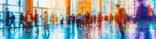 Blurred background of business people at the exhibition, conference, or meeting in a modern office interior with colorful glass walls Generative AI