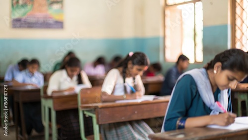 Blurred background of Indian classroom with teacher and students during exam prep