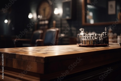 Blurred Barber Shop View with Wooden Table Background. Generative Ai.