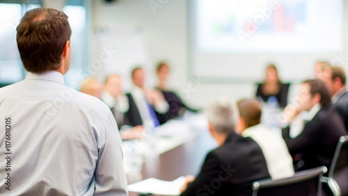 Blurred Boardroom Presentation: A blurred corporate boardroom with a focused business executive leading a presentation.