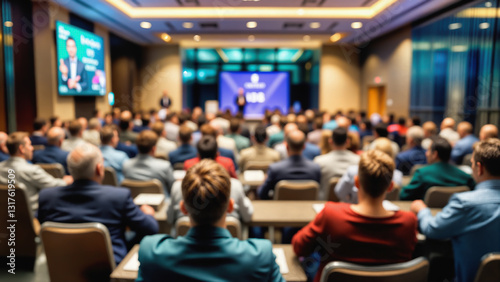 Blurred business conference with audience seated in rows facing presenter on stage. Corporate seminar environment with projection screens and professional attendees in modern venue with ambient