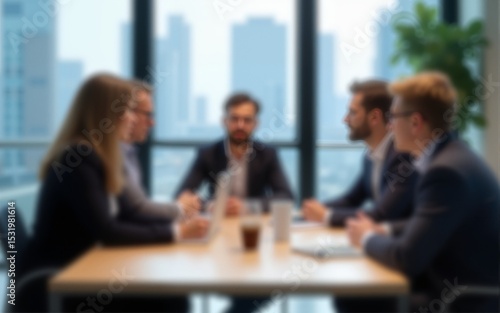 Blurred business people meeting in office interior with space for business brainstorming background design. High quality