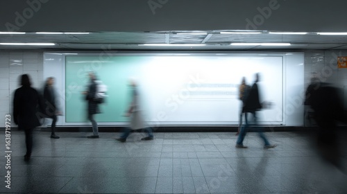 Blurred Commuters Walking Past a Blank Advertising Billboard in a Modern Subway Station