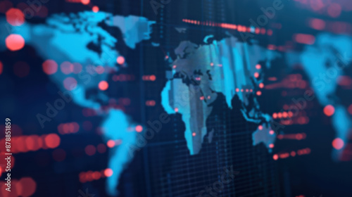 Blurred digital world map with glowing data points highlighting global connectivity and technological integration in a futuristic setting.
