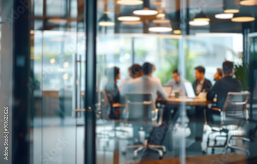 Blurred diverse group of businesspeople collaborating, smiling, and discussing work over laptops in a modern office setting.