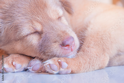 Blurred for background.Puppies with brown fur are lying on the white tile floor.