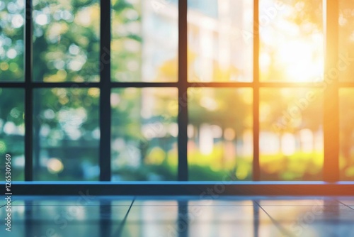 Blurred glass window interior background with sunlight shining through the windows. Blurry office or business center scene with large panoramic windows and a view of the natural landscape outside.