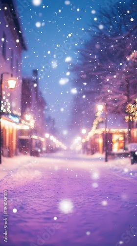 Blurred golden city lights glowing faintly on snowy streets, creating a serene and abstract winter urban background, style book illustration