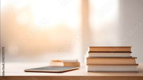 blurred image of a desk arranged with textbooks, stationery, and a tablet playing educational content, morning sun glare