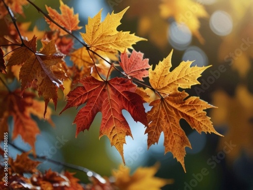 Blurred image of maple leaves on an autumn sunny day. Relaxing soft pale blue-green background. AI generated.