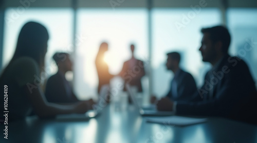 Blurred image of silhouettes of business people, managers, colleagues having a business conversation in a bright office