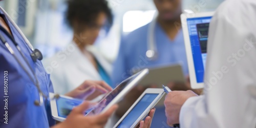 Blurred medical professionals are engaged in discussion with digital tablets and monitors in a clinical setting