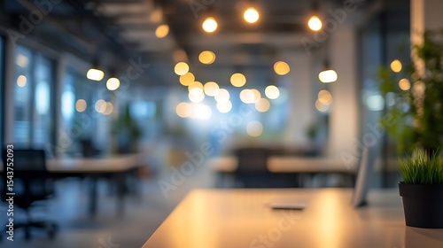 Blurred modern office interior with warm bokeh lights, highlighting an empty contemporary workspace designed for productivity and collaboration, conveying a professional and inviting atmosphere
